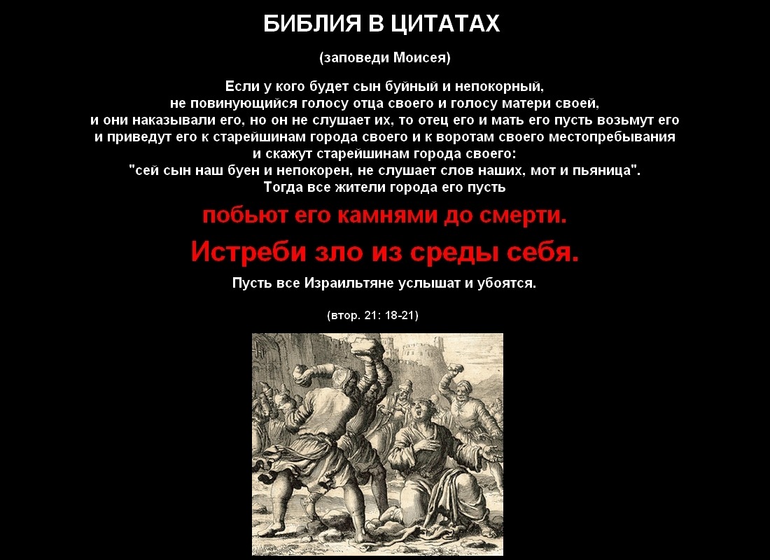 21 тогда все жители города его пусть побьют его камнями до смерти; и так истреби зло из среды себя, и все Израильтяне услышат и убоятся.