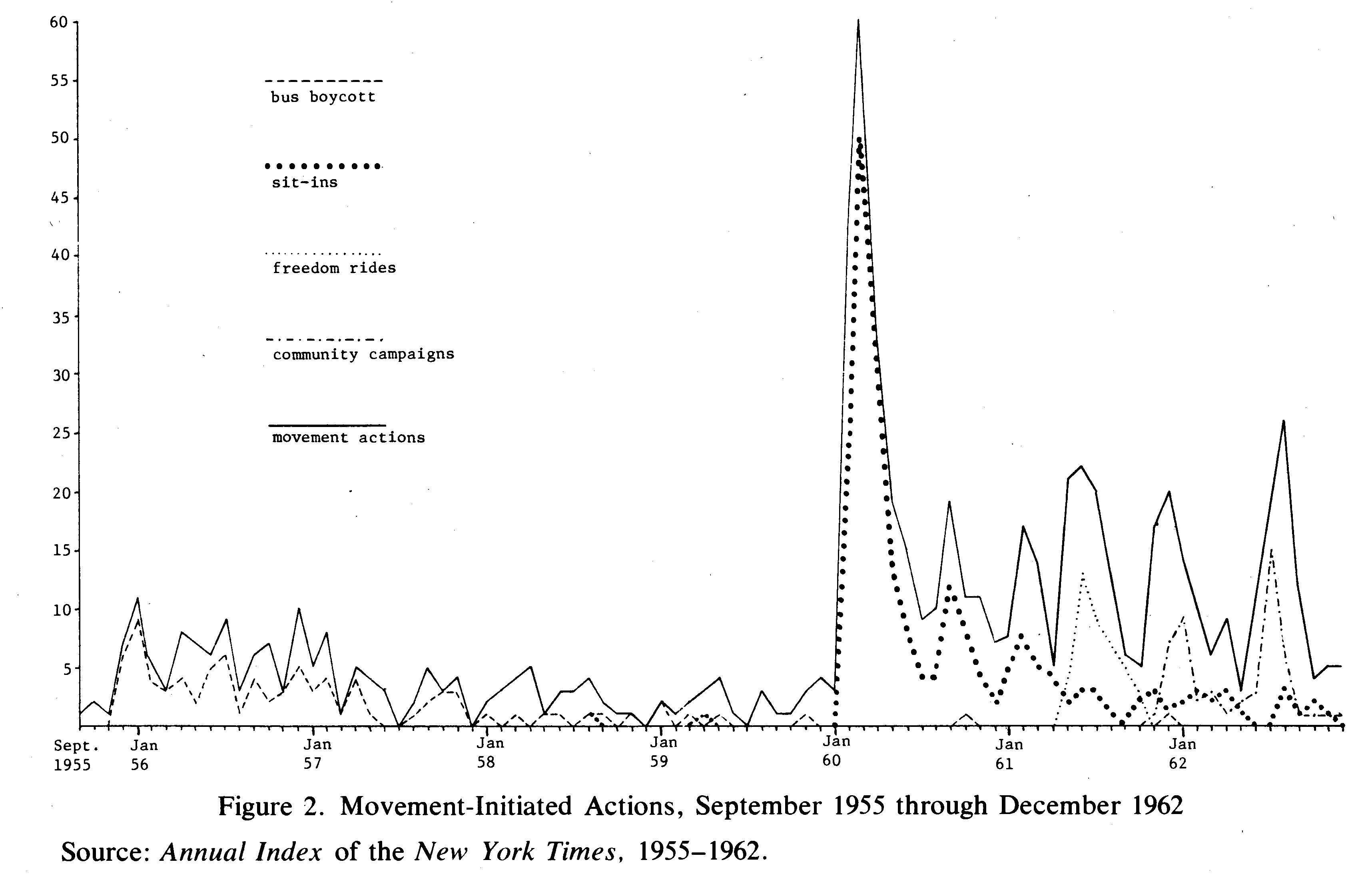 Излишнее представление некоторых внимание-ёмких протестных событий относительно других — частая проблема исследований протеста. Возможно, это повлияло и на наш график (доля «искусственных» акций тогда может быть ещё меньше).