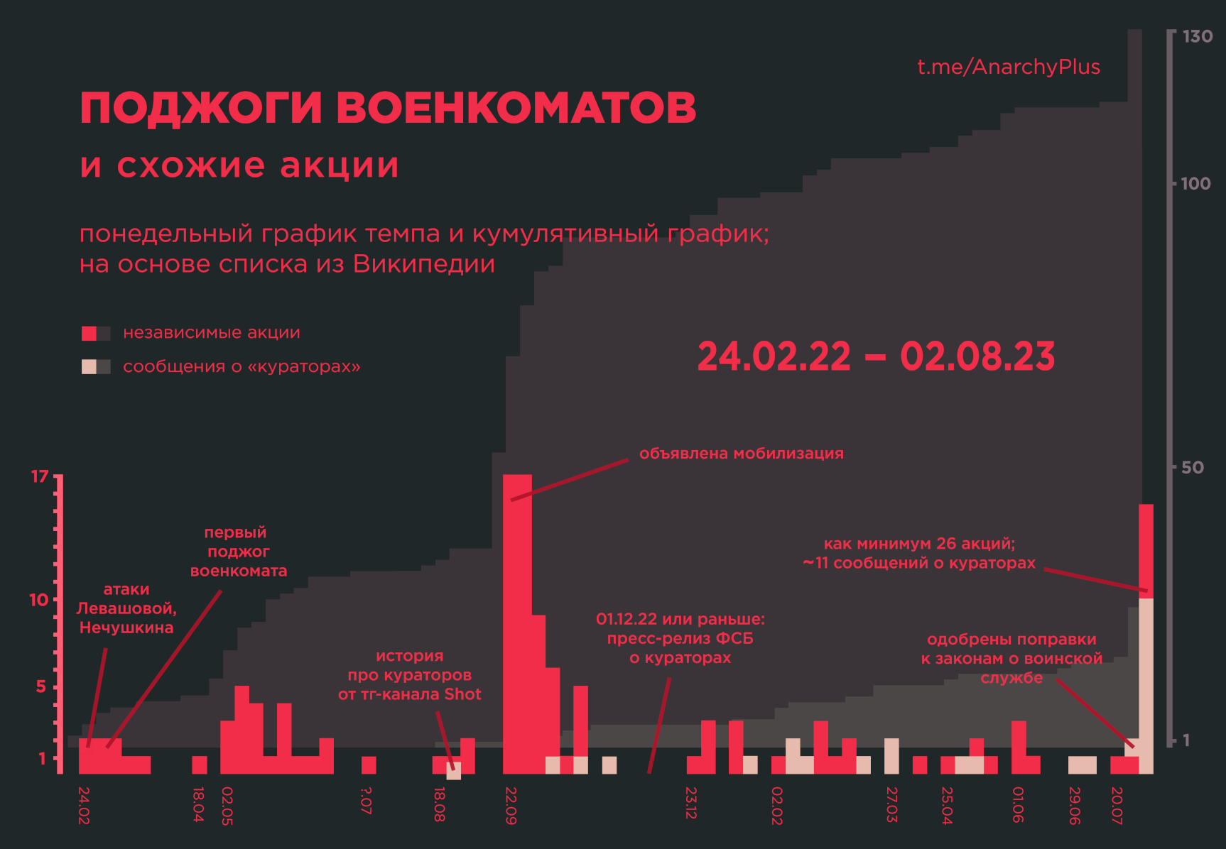 t.me/AnarchyPlusМы нанесли список атак с Википедии (и некоторые сообщения из других источников) на график, так как визуализация порой помогает быстро оценить происходящее. Сделали только картинку, поэтому с данными поиграться не получится. Также: никакой математики для анализа.