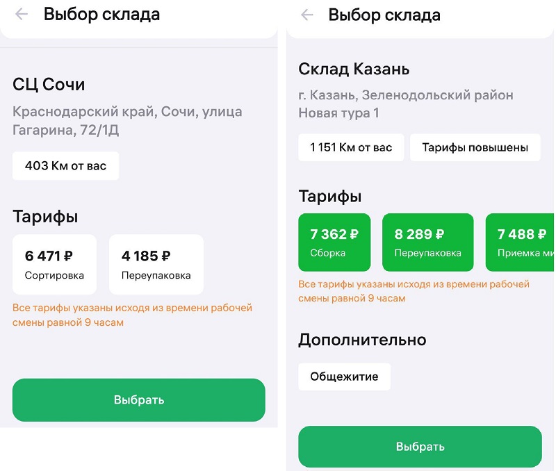 При нажатии на кнопку "выбрать склад" можно увидеть склады куда требуются сотрудники. Тут выбираю нужный склад и вижу адреса складов и тарифы на разные виды работ исходя из 9 часовой рабочей смены. Это упаковка после сборки, сортировка или переупаковка. Каждая работа оценивается по разному.