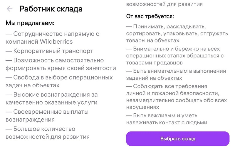 Итак, нажимаю на кнопку работник склада, попадаю в раздел с условиями, которые предлагает компания Вайлдберриз, а так же требования.