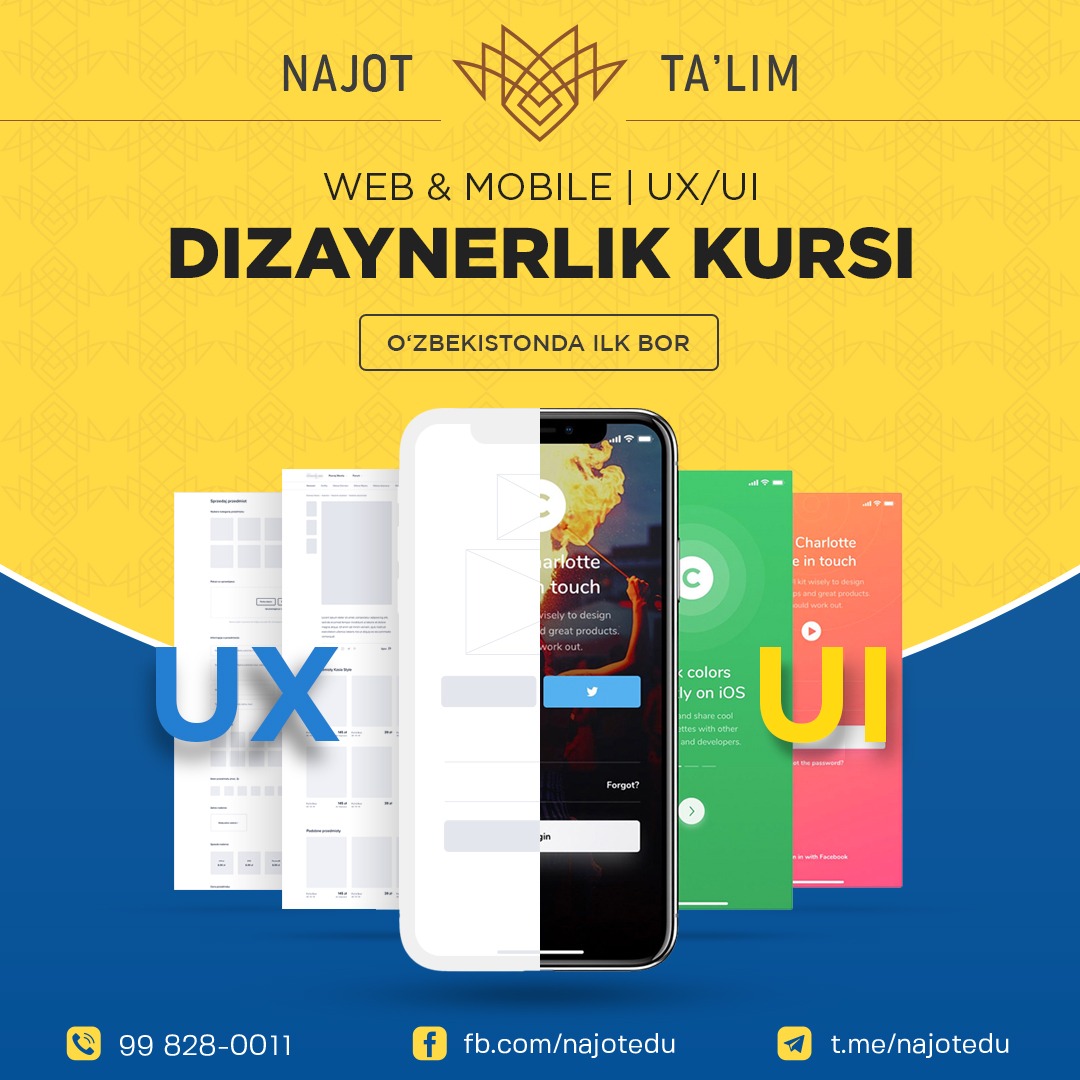 Najot Ta'limZamon talabidagi zamonaviy kasb egasi bo'lishni istaysizmi? Unday bo'lsa, Najot Ta'lim markazi sizni O'zbekistonda birinchi bor tashkil etilgan Web va mobil dizayn kurslariga taklif etadi.