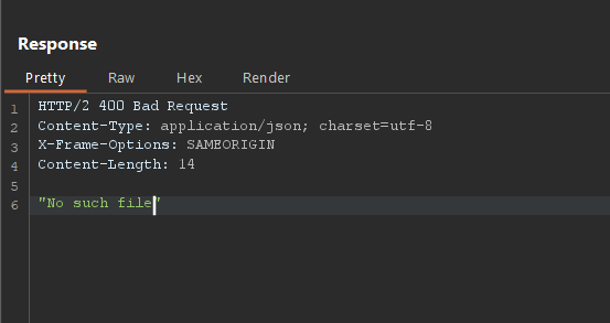 В ответе видим, что получаем код ошибки 400 и сообщение "No such file". Попробуем использовать null byte injection, чтобы обойти проверку и отсечь окончание.