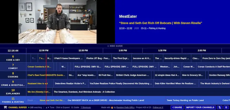 这个网页把 Youtube 改成传统的电视频道,每个频道都有节目表,可以切换频道。如果你不知道用 Youtube 看什么,就可以看这个网站。