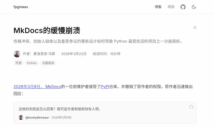 MkDocs 是著名的文档网站生成工具,但是主要贡献者之间有激烈矛盾,互相对抗,导致这个项目四分五裂。本文就梳理这件事。