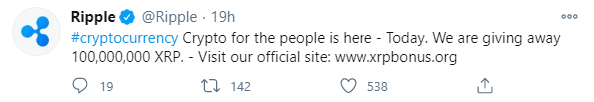 Ripple CEO Brad Garlinghouse and Ripple Foundation decided to run 100,000,000 XRP giveaway.