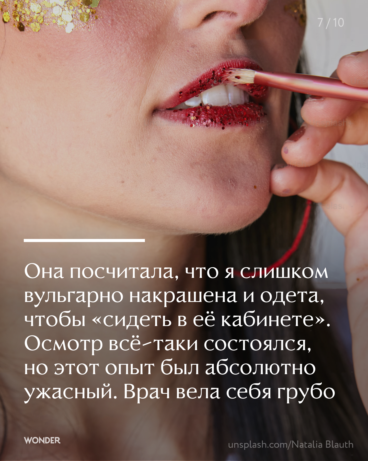 Еще один случай, которой врезался в мою память, — это первый поход к гинекологу. Я пришла на приём в джинсах на низкой талии, в топе на тонких лямках и со своим «базовым» мейком, и врач меня начала выгонять. Она посчитала, что я слишком вульгарно накрашена и одета, чтобы «сидеть в её кабинете». Осмотр всё-таки состоялся, но этот опыт был абсолютно ужасный. Врач вела себя грубо. Когда я сказала, что не веду половую жизнь, то начала говорить, что по мне видно, что у меня точно уже был сексуальный опыт, и я вру.