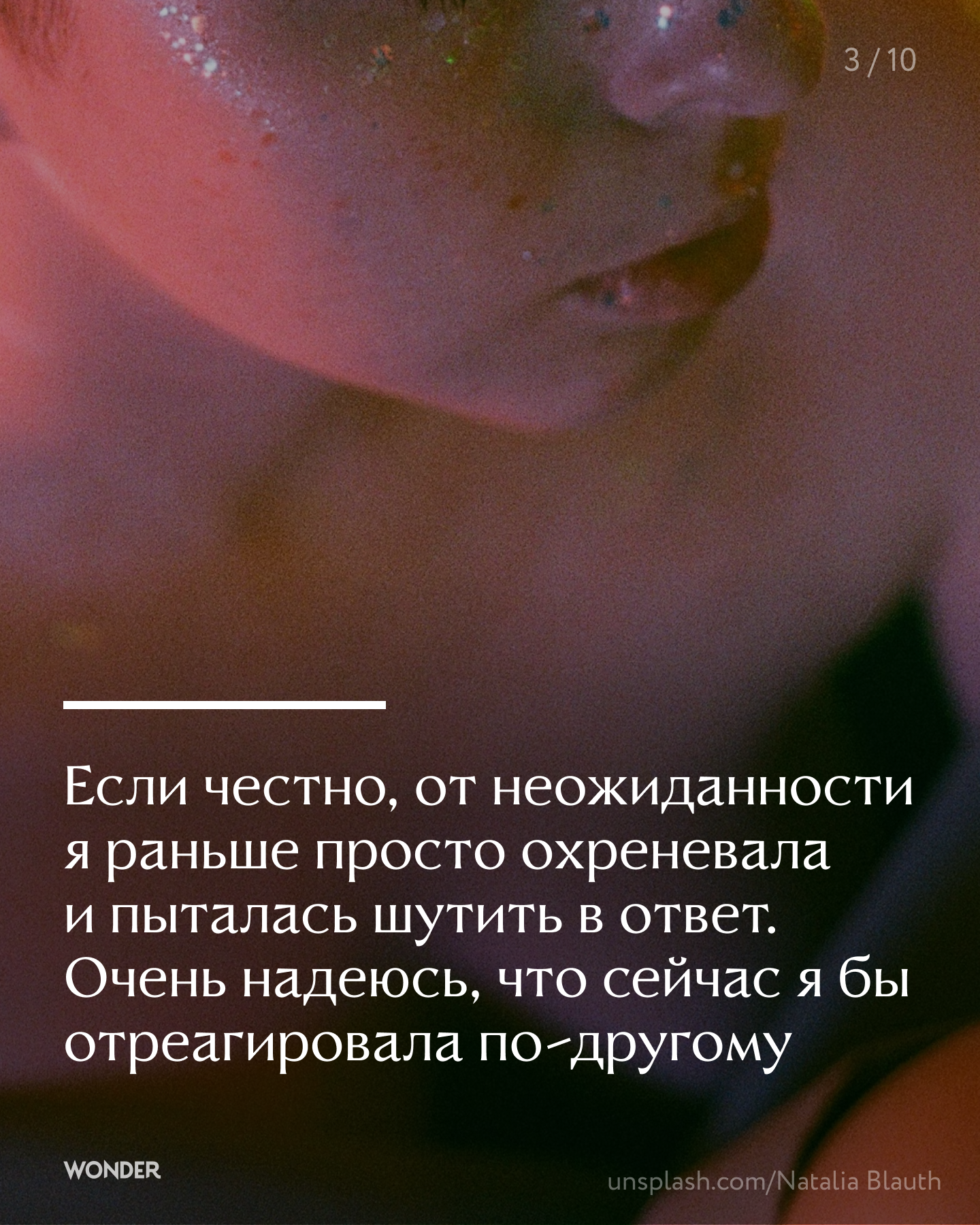 Долгое время я не могла понять связь между этими как будто участливыми замечаниями о моём внешнем виде и отсутствием макияжа и вежливо отвечала, что у меня всё хорошо. Когда поняла, стала реагировать иначе — конечно же, тоже вежливо, но уже так, чтобы поставить человека в неловкое положение, потому что никто не должен выслушивать непрошенные комментарии. Все подобные случаи расстраивают в контексте того, насколько в России стандартизированы представления о внешности и как пугают людей проявления индивидуальности, даже вот такой абсолютно естественной.