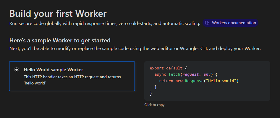۳. در صفحه Build your first Worker بر روی Create Worker بزنید