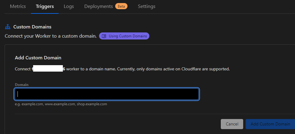 ۷. گزینه Add Custom Domain رو انتخاب کرده و یه سابدامین (از بین دامینهایی که داخل همین اکانت کلودفلرتون دارید) ست کنید. مثلا wrkr.mydomain.com