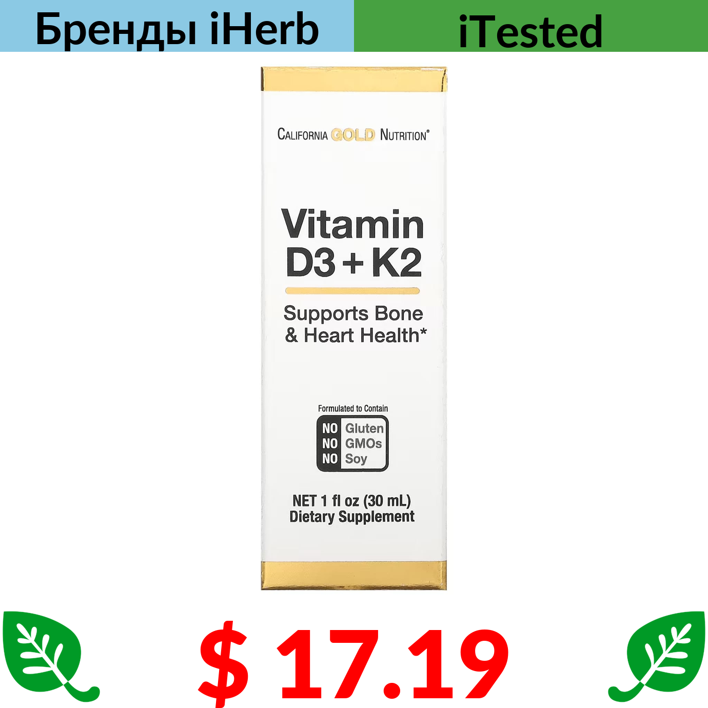 $ 17.19 California Gold Nutrition, витамины D3 и K2, 25 мкг (1000 МЕ), 30 мл (1 жидк. унция)