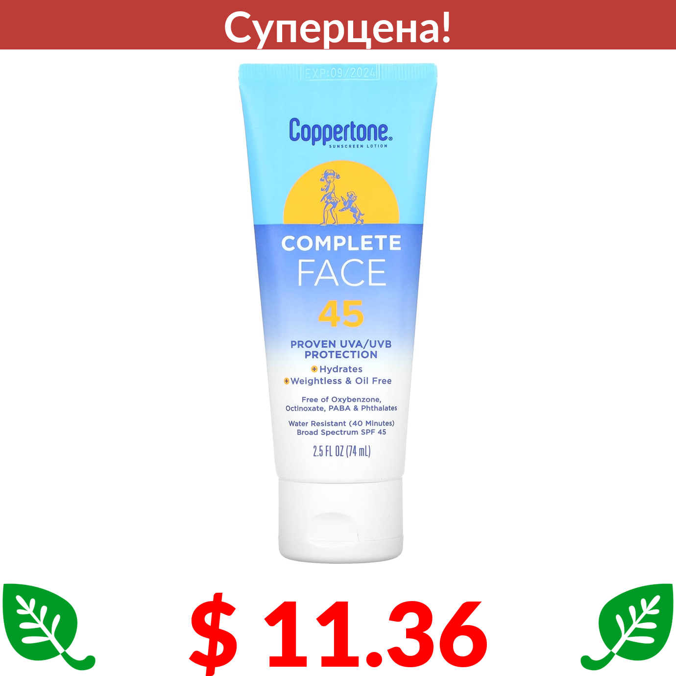 $ 11.36 Coppertone, Солнцезащитный лосьон для лица, SPF 45, 74 мл (2,5 жидк. Унции)