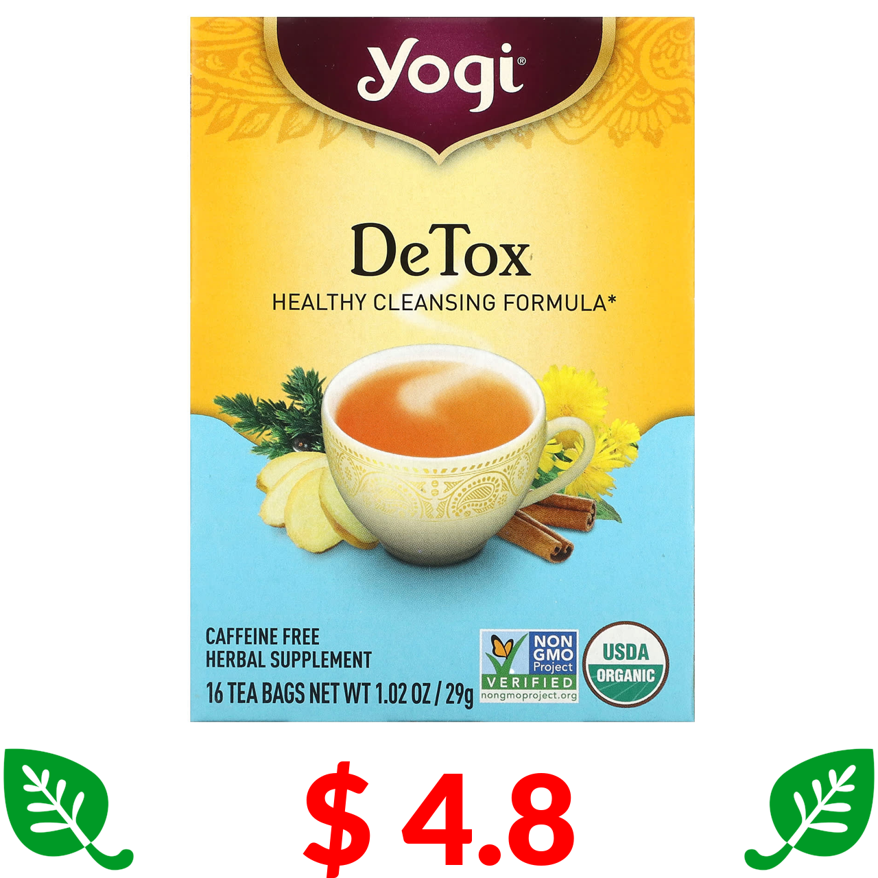 $ 4.8 Йоги Ти, Detox, без кофеина, 16 чайных пакетиков, 29 г (1,02 унции)