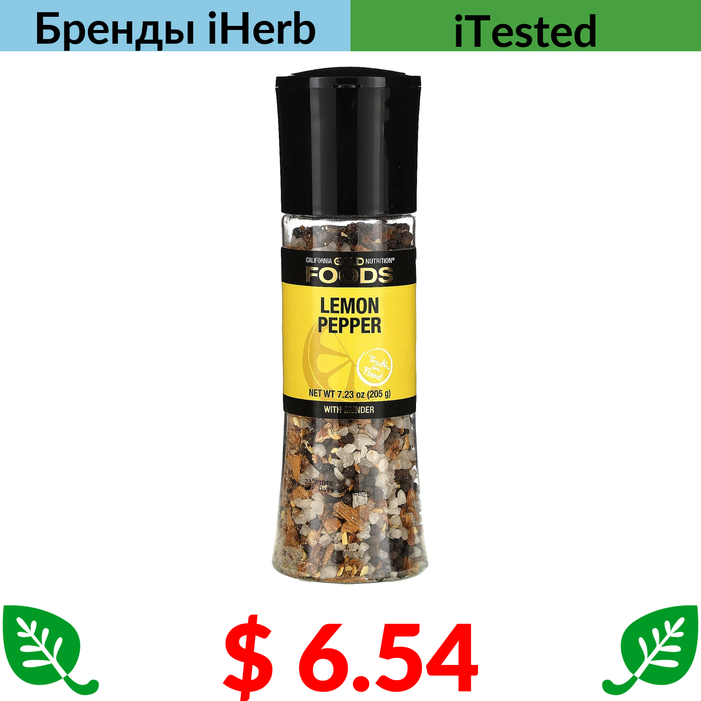 $ 6.54 California Gold Nutrition, FOODS, соль с лимоном и перцем в мельнице, 205 г (7,23 унции)