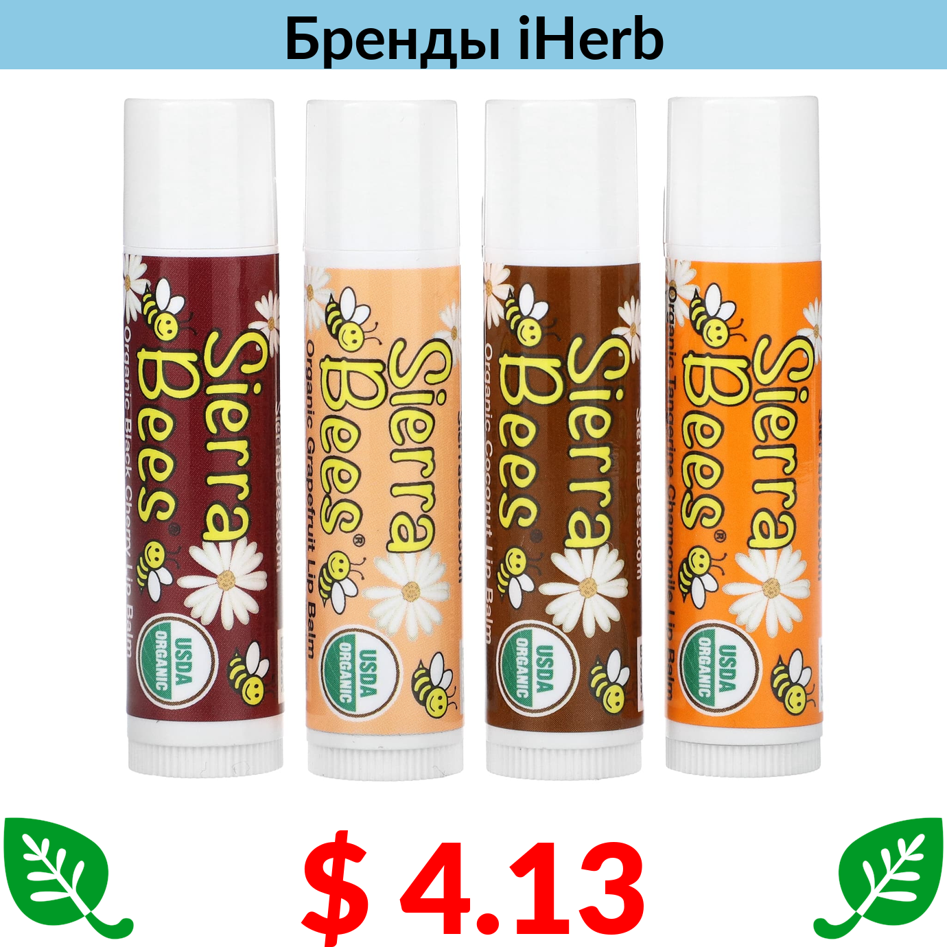 $ 4.13 Sierra Bees, набор органических бальзамов для губ, 4 штуки, вес: 4,25 г (0,15 унции) каждый
