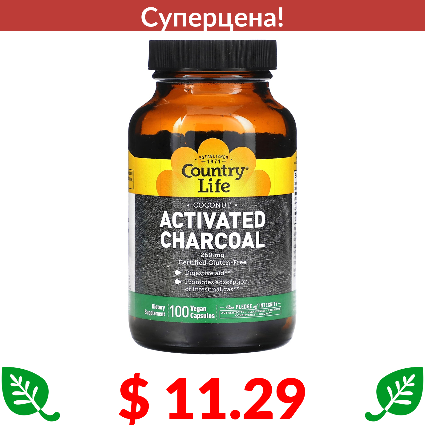 $ 11.29 Кантри Лайф, Активированный уголь, 260 мг, 100 веганских капсул