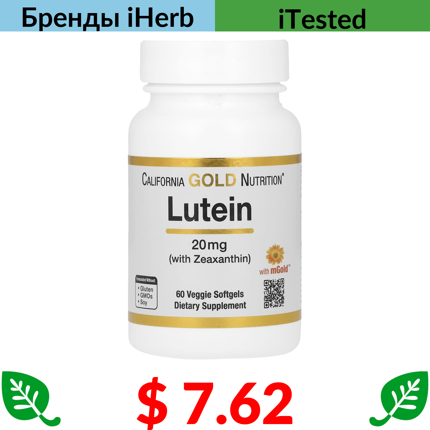 $ 7.62 California Gold Nutrition, лютеин с зеаксантином, 20 мг, 60 растительных капсул