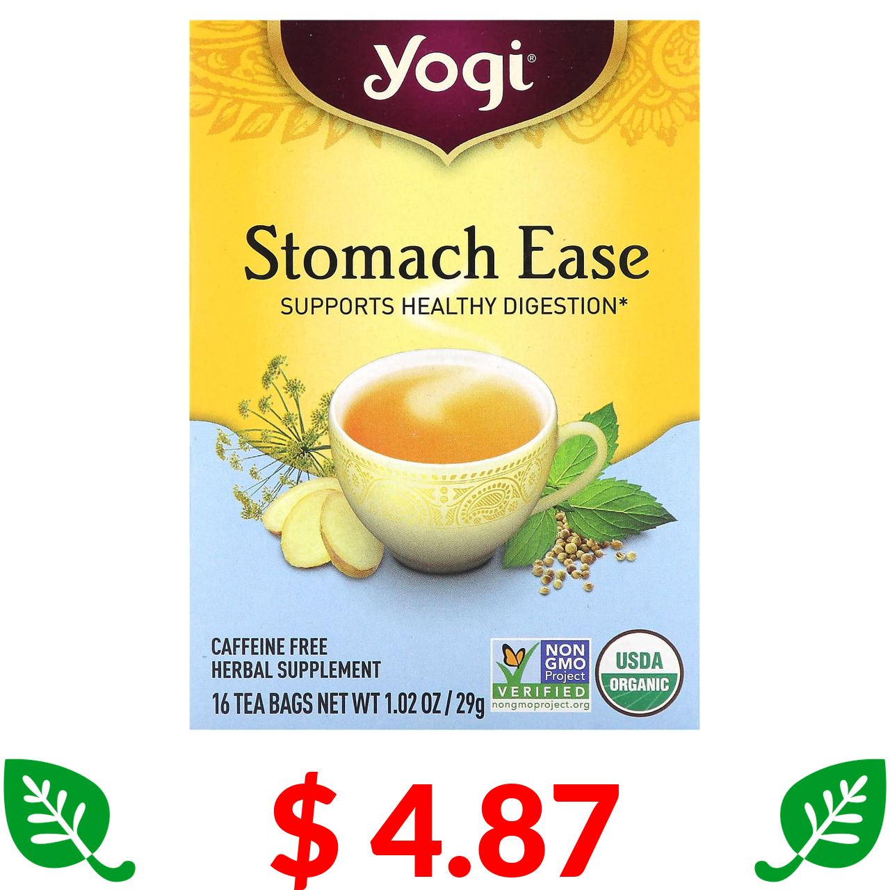 $ 4.87 Йоги Ти, Stomach Ease, без кофеина, 16 чайных пакетиков, 29 г (1,02 унции)