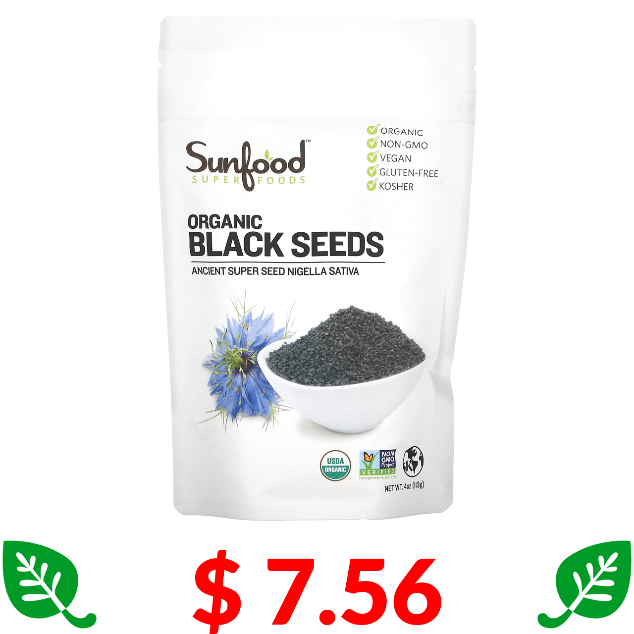 $ 7.56 Sunfood, Органічні чорні насіння, 4 унції (113 г)