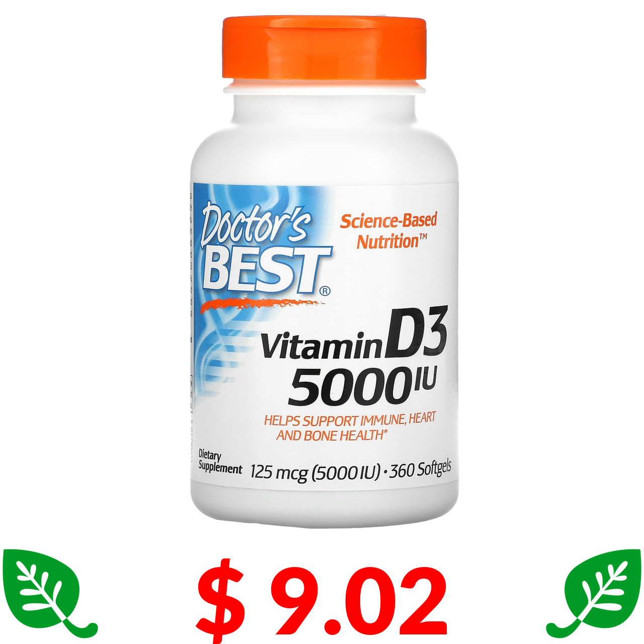 $ 9.02 Докторс Бэст, витамин D3, 125 мкг (5000 МЕ), 360 мягких таблеток
