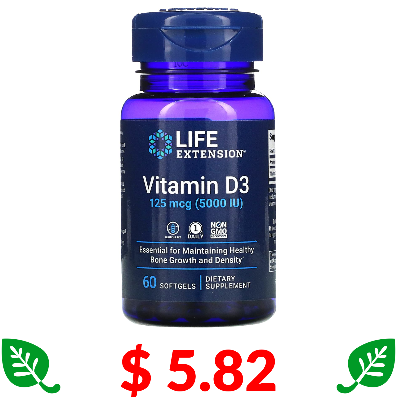 $ 5.82 Life Extension, витамин D3, 125 мкг (5000 МЕ), 60 капсул