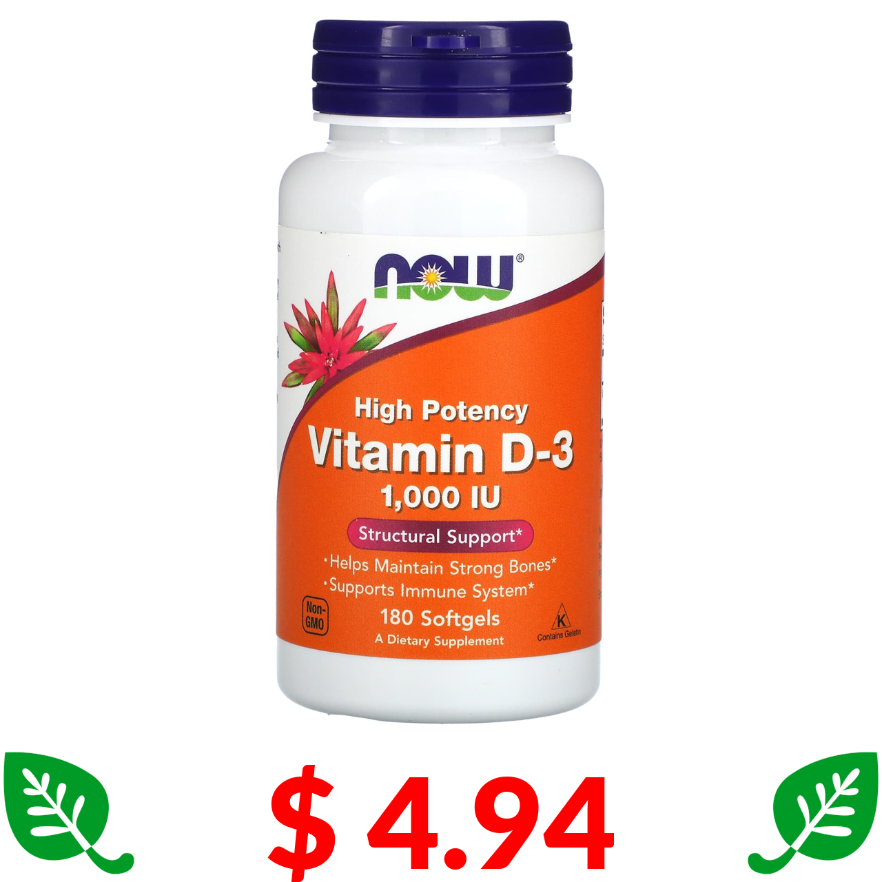 $ 4.94 Now Foods, витамин D3, высокоактивный, 1000 МЕ, 180 мягких таблеток