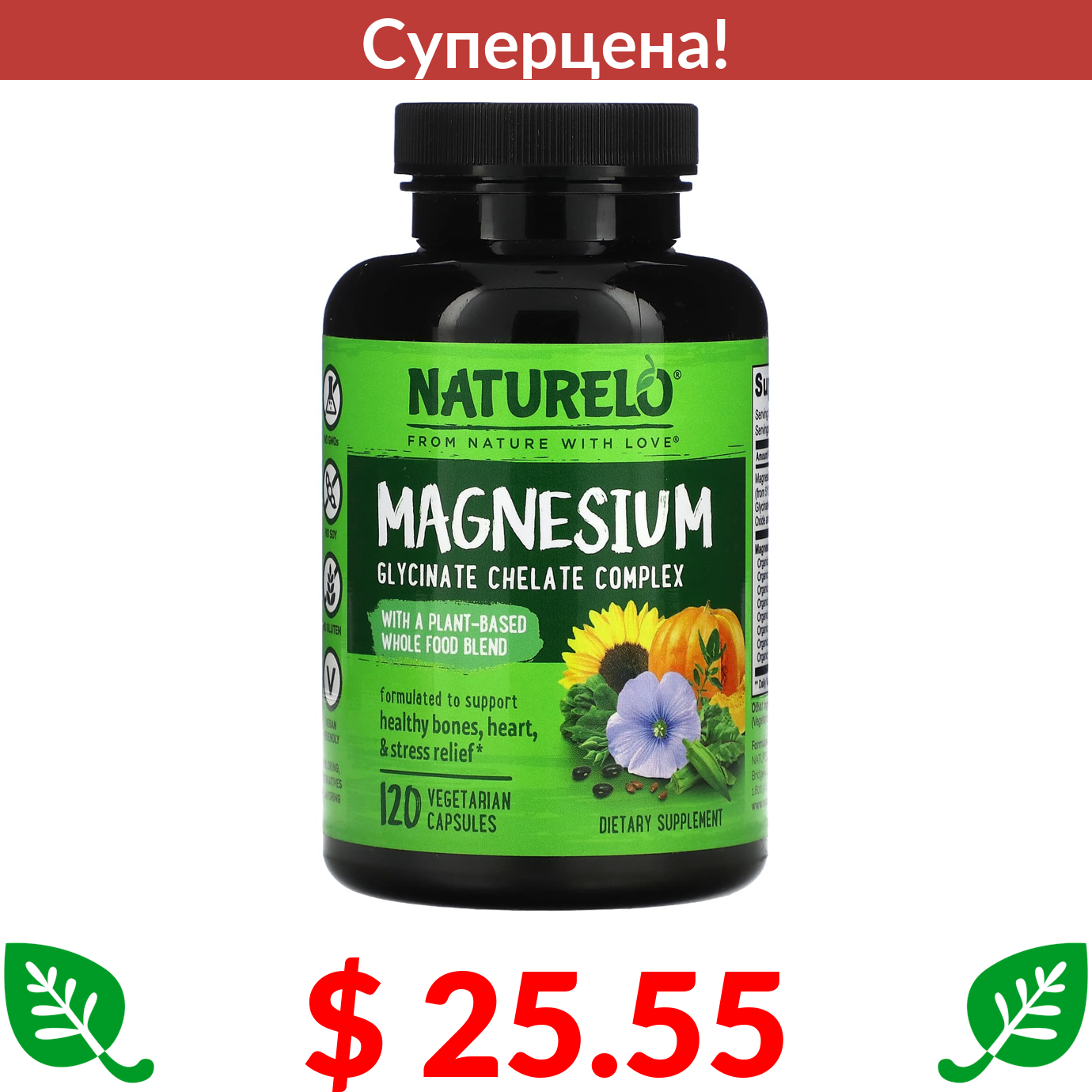 $ 25.55 НАТУРЕЛО, хелат глицината магния, 200 мг, 120 вегетарианских капсул