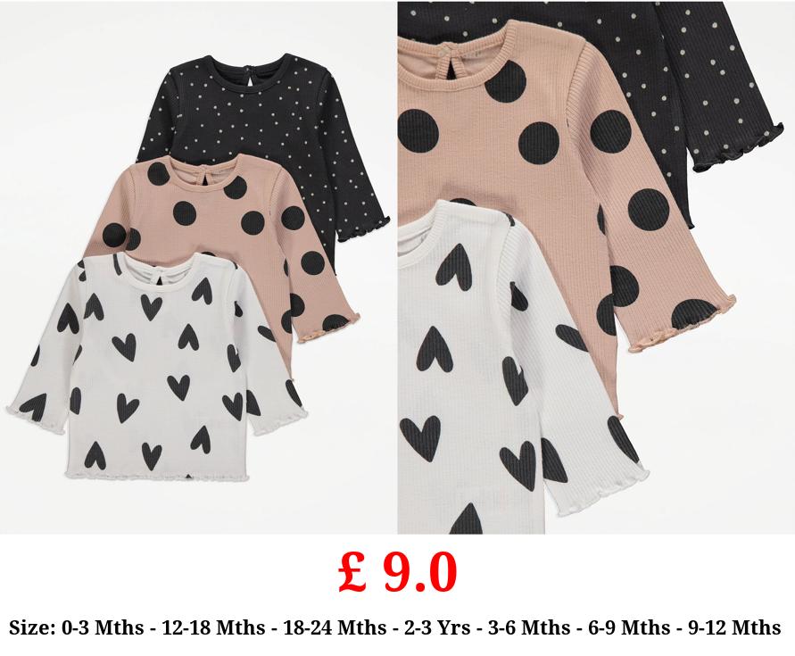 £ 9.0 Spot Heart Ribbed Long Sleeve Tops 3 Pack