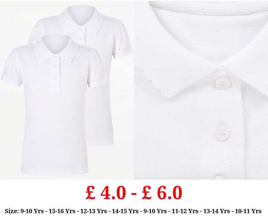 £ 4.0 - £ 6.0 Girls White Scallop Short Sleeve School Polo Shirts 2 Pack