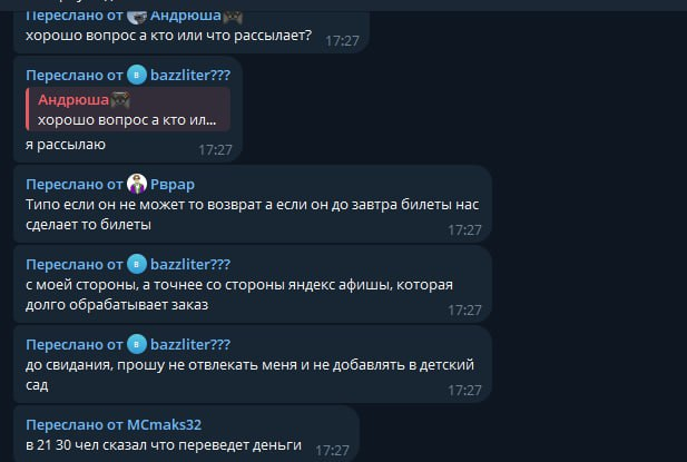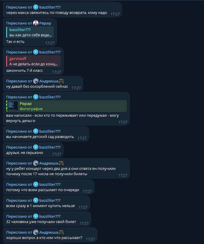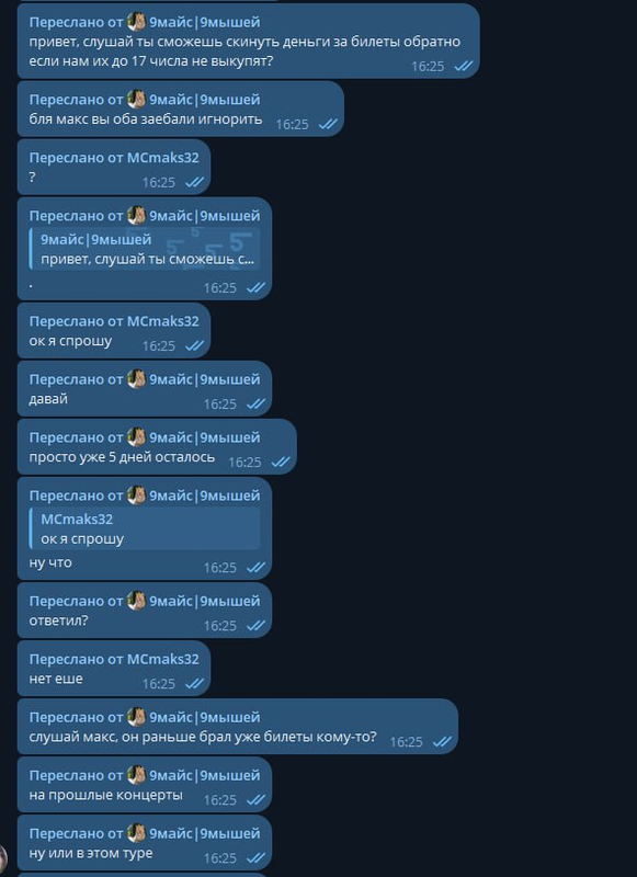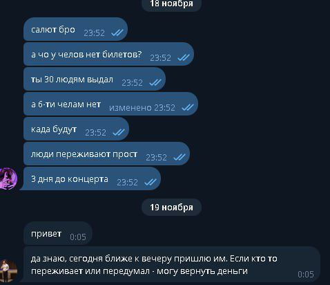 Короче макс предложил билеты со скидкой, после того как мы скинули ему деньги он переносил даты. Мы ему писали очень долго, но он нас игнорил. В итоге уже в день концерта он нам ели как вернул деньги, и то не в полном размере. Только спустя месяц он полностью их вернул