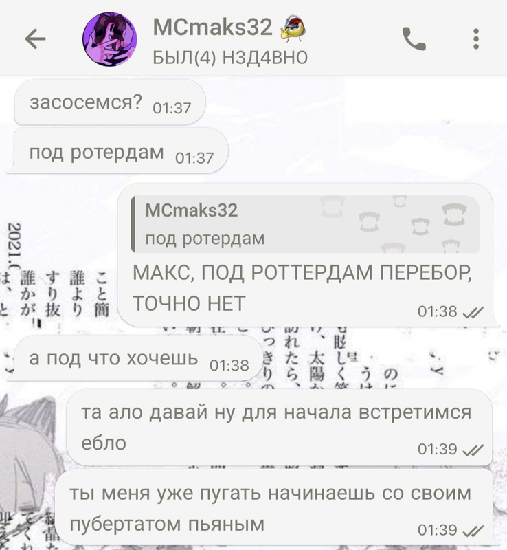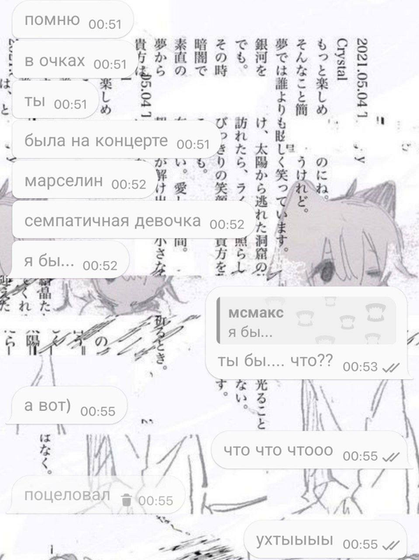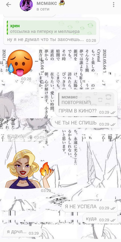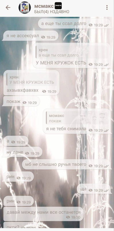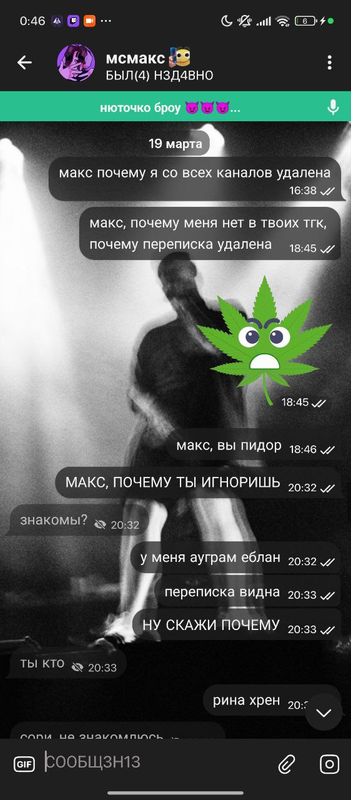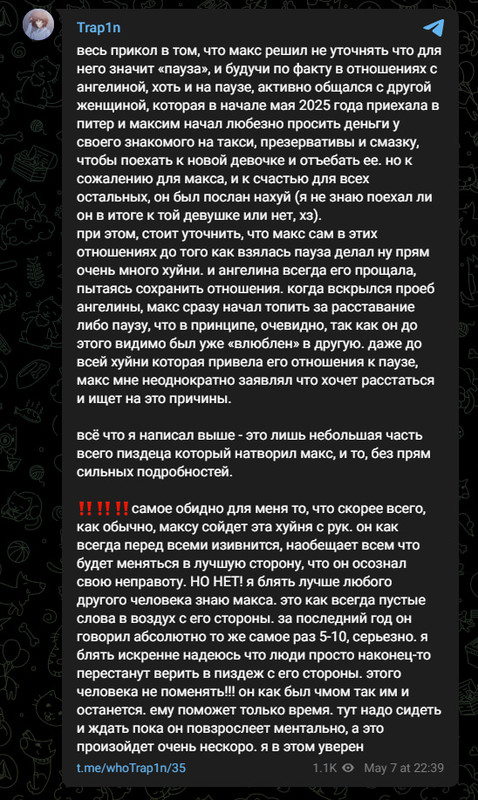 познакомились с максом мы 31 марта 2024 года, чутка общались, ниче интересного не было. 25 октября, после первого концерта стинта, начали общатся больше и он начал ко мне подкалывать, звал гулять. в ночь с 28 по 29 мы с ним пошли наконец то гулять, на первом видео он меня ждал. он купил выпить, мы сначала сидели на скамейке и общались, потом он выпил бутылку эссы и начал умолять меня с ним целоваться, звал в отель. когда я сказала ему что целования до отношений хуйня, он предложил мне встречаться (я по рофлу согласилась, это хайп). после того как я согласилась, он сразу ко мне полез, кусал губы, под футболку лез. потом он ссать захотел и после того как он нассал на соседний дом, мы разошлись. утром мне написал мой знакомый (дёма, бывший участник шуба сквада) и яйцефонк, у дёмы был кружок где меня видно с мсмаксом и яйцафонк тоже откуда то знал, что у меня с мсмаксом были мутки.крч слили нас в какой то канал,скорее всего мсмакс скинул кому то, хоть и писал что не скидывал.после того как я написала про слив кружка, макс почистил переписку и удалил почти все сообщения. друг(зетиз), которому я рассказала про эту ситуацию, задонатил косте, который был в звонке с максом, макс делал вид что не знает меня и т.д. спустя какое то время я забила на эту хуйню и просто рассказывала друзьям что ко мне приезжал пьяный мсмакс и писал мне "засосемся? под ротердам", даже гифку сделала и юзала её в качестве прикола с друзьями.через месяца 3, после того как я сделала из этой гифки мем, кто то из моих знакомых прислал гифку мсмаксу, после чего мсмакс забанил меня во всех своих тгк, когда я пыталась ему объясниться, что бы не терять общение, он меня не слушал и после начал игнорировать(переписка с 2 по 12 фото). когда мы встретились на ФУХе, он максимально меня избегал и никак не объяснился, вот так закончилось мое общение с мсмаксом. а еще он пидор.