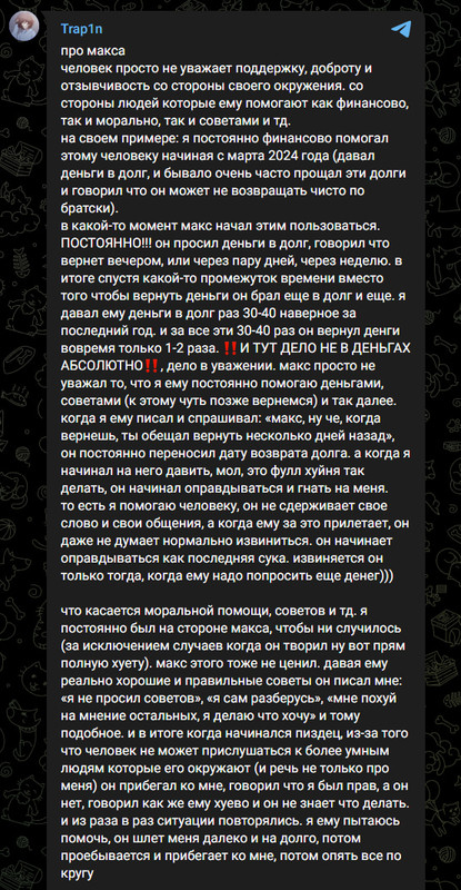 Он жил год на долги, просто постоянно брал то у меня в долг, то у других людей. И в какой-то момент он начал брать долги, чтобы возвращать другим людям долги. То есть, допустим, вчера, когда Макс понял, что, кажется, начинается пиздец, он мне начал писать: «Артём, а если я тебе сегодня до такого-то времени верну 26 тысяч, которые я тебе должен, ты не будешь про меня ничего сливать?» Я ему пишу: «Чел, дело уже нахуй вообще абсолютно не в деньгах, и дела в деньгах никогда не было». Тут идёт речь про твоё отношение ко мне и про то, что ты меня, видимо, просто нахуй не уважаешь. И оказалось, что он начал писать некоторым людям и просить у них деньги в долг для того, чтобы вернуть мне долг.