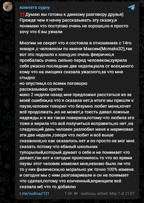 Видео как МАКСУ РАЗЖОВУЮТ что он имзенил своей девушке (он это отрицал): t.me/sudnuu/137