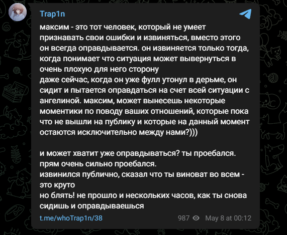 Первый пост в телеграм канале Ангелины по поводу этой ситуации: