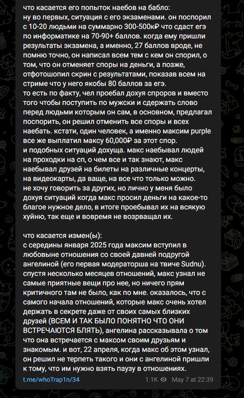 Макса забанили, получается, в марте 2024 года на Твиче. У него деньги были чисто с Твича — с рекламы там и так далее. Твич забанили — всё, чел без денег, и он у меня начал просить в долг. Ещё, получается, в конце марта 2024 года он просил что-то около 5000, но он вроде их сразу вернул. Потом ещё в конце весны 2024 года или в начале лета он попросил ещё 10000, и вот уже тогда он не мог вернуть месяц или два, блядь, если честно, не помню, но потом тоже вернул. Потом у нас с ним был конфликт, который я вообще никак не хочу затрагивать в медийной сфере и так далее — но не суть — он длился до, наверное, октября плюс-минус 2024 года. Потом мы с ним помирились, начали опять охуенно общаться, прям очень охуенно. Он начал там по чуть-чуть опять брать в долг, но там были не особо большие суммы — там 3000 рублей, может 5000 максимум. И вот он с октября набрал тысяч 17, наверное, суммарно долгов. Я не помню точно, могу ошибаться. И в декабре вернул всё это разом, насколько я помню. И потом в январе, получается, когда он начал встречаться с Ангелиной, он попросил у меня 30000 рублей в долг на то, чтобы привезти Ангелину в Питер. Я ему дал эти 30000, и он не мог Ангелину привезти в Питер, наверное, месяца два или три. Она к нему приехала только в конце апреля. Он два месяца не мог её нормально привезти. Потом в феврале Макс взял ещё 30000 — и там началось. Он начал брать дохуища денег у меня — вот каждый раз сумма долга всё увеличивалась, увеличивалась, и дошла в какой-то момент почти до 70000. И помимо меня он дохуя у кого брал, и у некоторых людей он не то чтобы просто брал — он как бы, ну, пытался наебать на деньги. Я знаю одну ситуацию, когда он, короче, наебал свою подругу и её друзей на билеты на концерт — вроде Мазелова или Славы КПСС. Макс сказал, что он может их купить по скидке, ему скинули деньги, а он там что-то тянул-тянул время, и вот уже наступил день концерта. Макс начал писать, что, блядь, видимо, билетов не будет, всё-таки, сори, я потом вам верну. И в итоге люди либо не попали на концерт, либо попали, но им пришлось уже снова тратить деньги, чтобы самим купить билеты. И Макс такие вот махинации проводил не раз. То есть он предлагал через него что-то купить — видеокарты, блядь, билеты, проходки, вообще всё что угодно. Ему давали деньги — и в итоге Макс начинал сливаться.