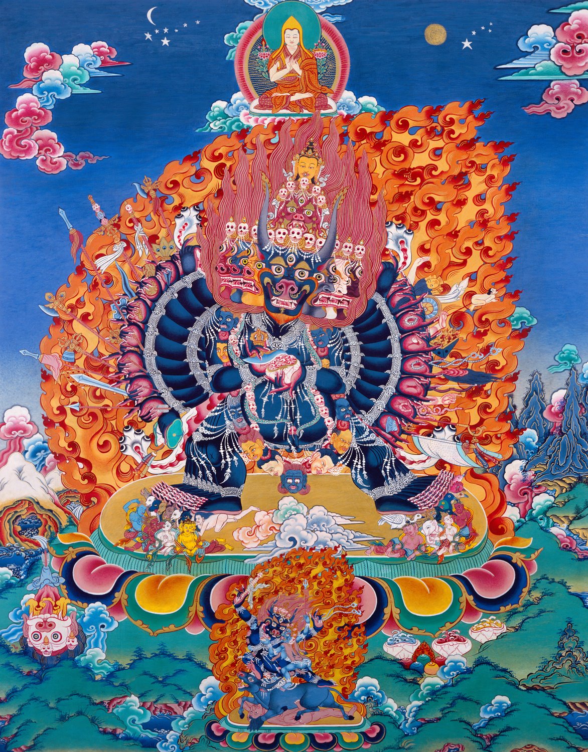 今天我们要以修持薄伽梵吉祥大威德金刚来进行火供,大威德金刚是十方诸佛之智,为了调伏内、外、秘密三种魔类的显现。觉悟甚深空性之怙主文殊菩萨,以稍显忿怒显现者为红阎魔敌,较其更显忿怒之显现为黑阎魔敌,而最忿怒者,为摧灭一切恶类,化现成大力忿怒明王身之本尊即吉祥大威德金刚。而大威德金刚的修行要诀,一般其虽归属父续,但母续与父续修行的要诀全部具足,幻化身与光明的修行要诀皆具,不仅如此,还有其它密续所没有之五个甚深特点,加持力量大迅速,在此五浊恶世之时,恶见充斥,不守三昧耶戒与律仪,福德甚为浅薄,诸多内外危害障碍,犹如雨下一般,若不能依此本尊瑜伽来修持的话,是有堕入障碍的危险。若修持此本尊瑜伽,一切不顺、障碍及伤害将不能扰犯与为害。