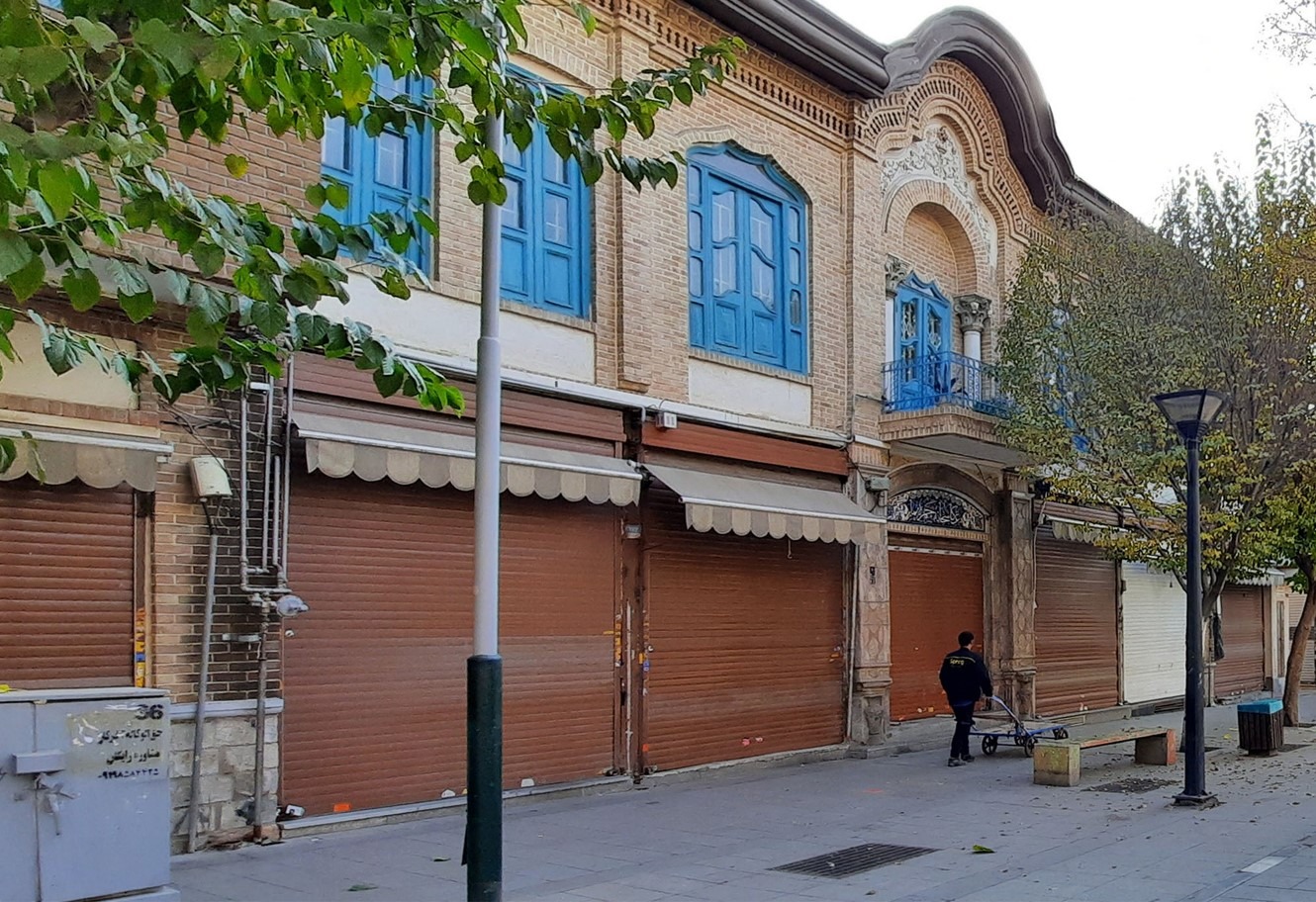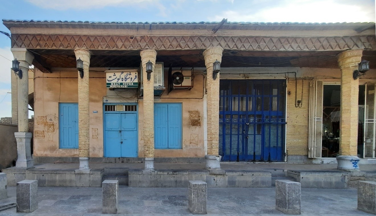 در و پنجرههای آبی کمرنگ، نردههای آبی پررنگ؛ ایکاش مغازهی بغل هم نردههایش را به رنگ خانوادهی آبی در میآورد و الی آخر؛ در نهایت هم نمای شهری یک طبقهی آجریای خلق میشد که طیفهای مختلفی از آبی در درها و پنجرههایی با ابعاد و ارتفاعهای مختلف، در زمینهی کرمرنگ ستونها و آجر نشسته بودند.