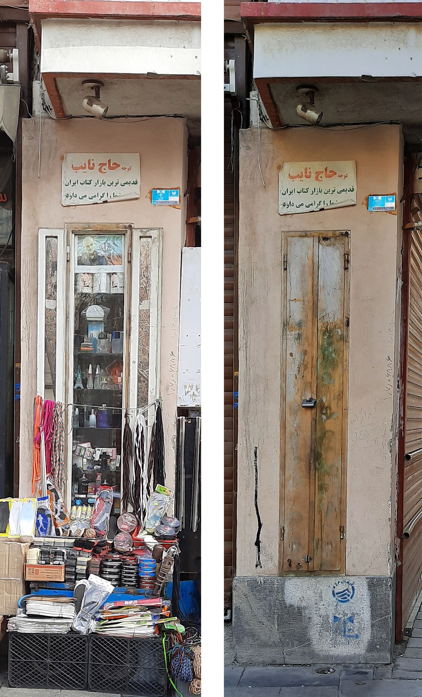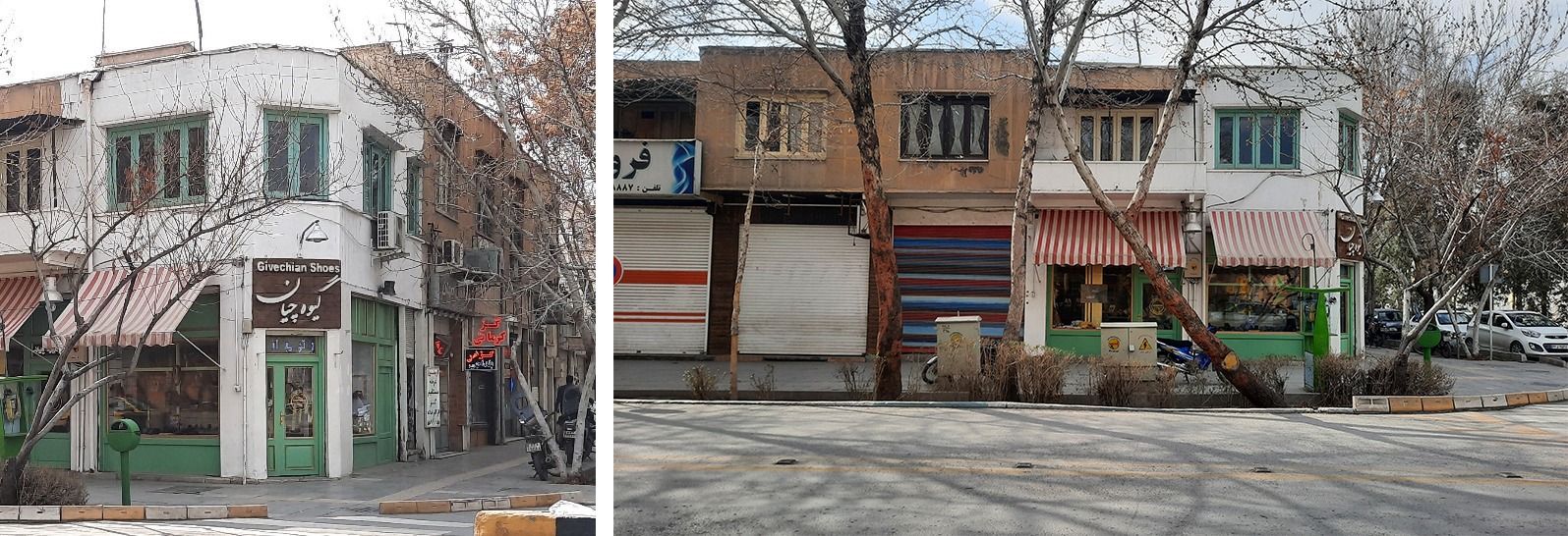 نمای سفید، ویترینهای سبز و شاید مهمتر از همه سایهبانهای راهراه مغازهی کفشفروشی گیوهچیان. فقط ایکاش راههای درهای کرکرهای سمت چپ تصویر هم به پیروی از در وسطی، به رنگهای مختلف درمیآمدند و همچنین درهای کرکرهای دیگری هم اگر تا انتهای خیابان وجود داشتند؛ در این صورت نمای شهری راهراهی از رنگهای مختلف شکل میگرفت که ابتدای آن راهراههای عمودی سایهبان بود و بقیه راهراههای افقی درهای کرکرهای.