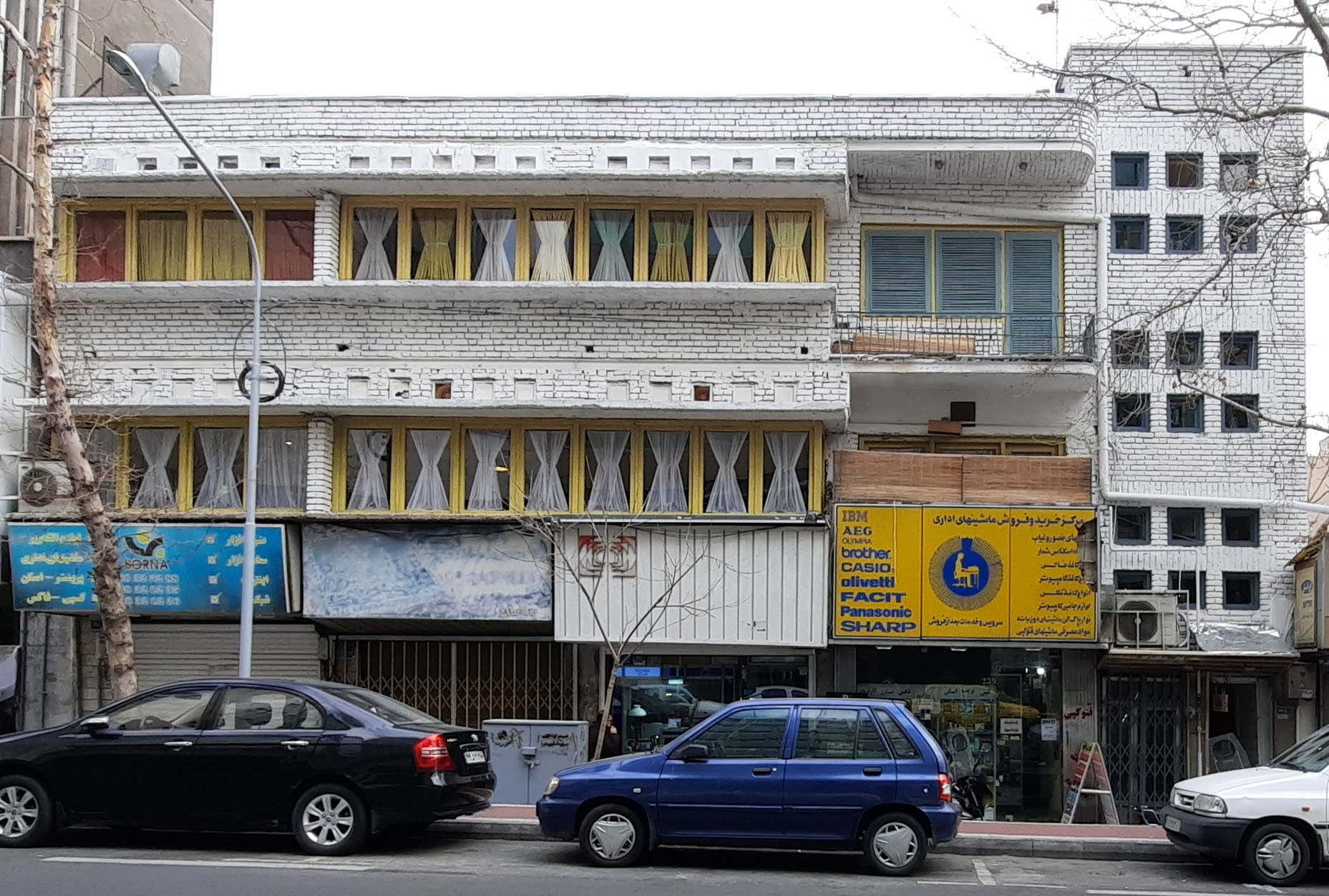 چارچوب پنجرهها زرد شدهاند و کرکرهها به رنگ آبی سیر؛ اگر تمام پردههای پشت سرشان هم از قاعدهی چهار پنجرهی سمت چپ طبقهی بالا پیروی میکردند، عالی میشد؛ یکی دوتا در میان زرد و سرخابی. این زردها محال بود که در زمینهای به غیر از آجرهای سفید، جذابیت پیدا کنند و نقش تابلوی زردرنگ هم در رنگبازی این نما، پررنگ است.