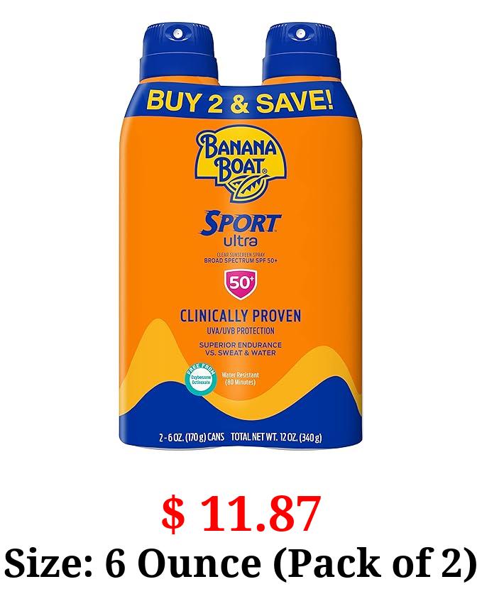 $ 11.87 Size: 6 Ounce (Pack of 2) Banana Boat Sport Ultra SPF 50 Sunscreen Spray Twin Pack | Banana Boat Sunscreen Spray SPF 50, Spray On Sunscreen, Water Resistant Sunscreen, Oxybenzone Free Sunscreen Pack, 6oz each