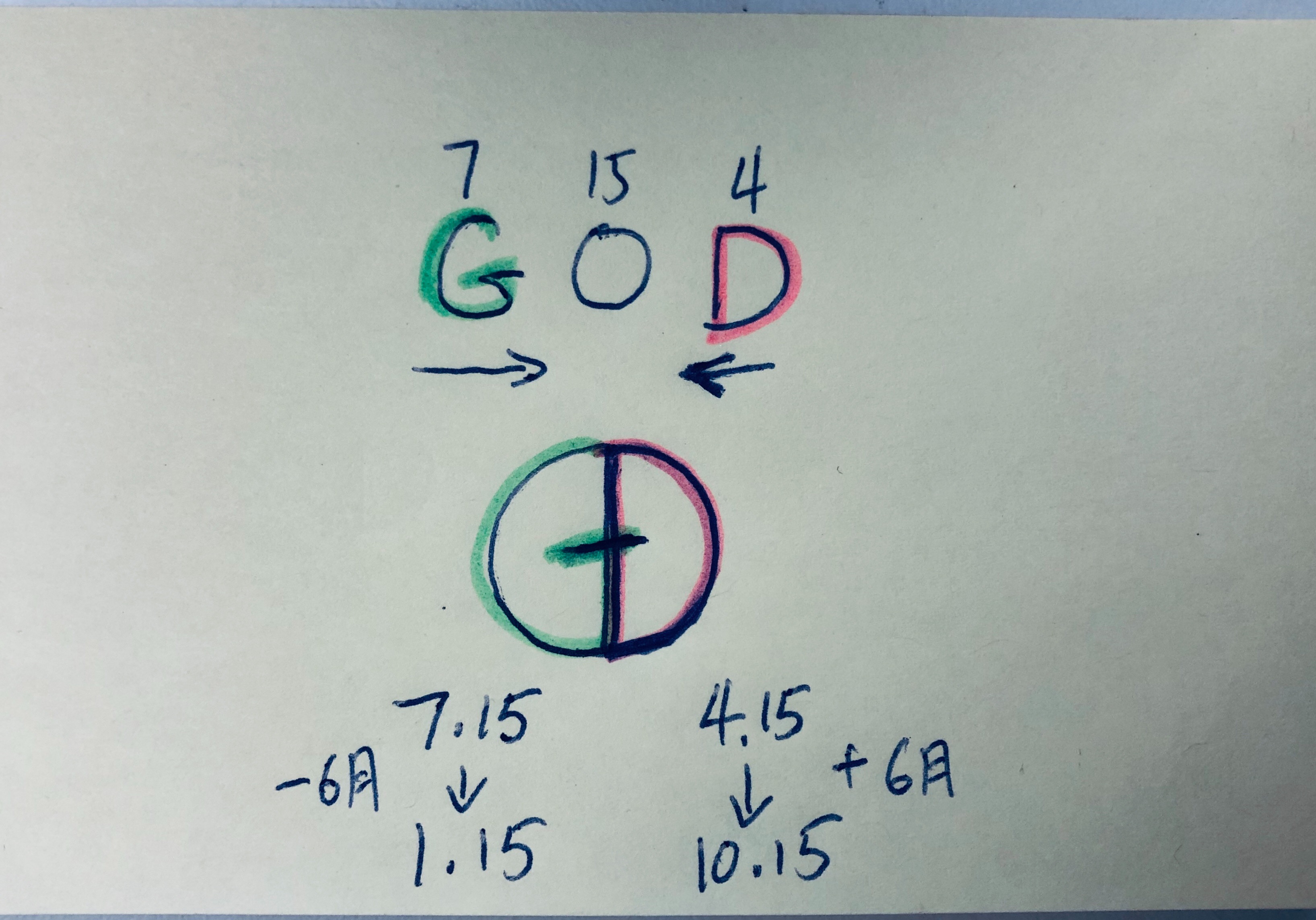 G是7,O呢,是第15。D呢,是第4。意味着,这边数是415,从这边数是715。7月15,这边是4月15。但是大家记住,在圆周上,分成三组给大家讲过。就是三春之门,14710,25811,36912。耶稣,就义于逾越节,115。生于住棚节,就是7月15。(兩個均為猶太教節日)圆周上1.15对应这个7.15。这个4.15对应这个10.15。就是中国的三元节。