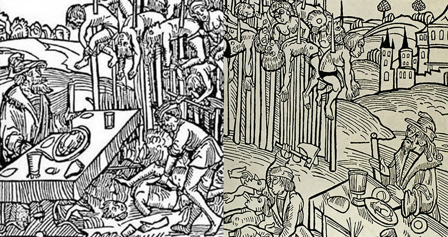 當時奧斯曼,蘇丹大軍(土耳其大軍)要去討伐他。德古拉伯爵使了個什麽招呢?他就從他的國境線開始,一直到到他都城的路上,路兩邊,樹立了無數座木樁。每個木樁上都穿著一個人,從肛門穿進去從嘴穿出來。到底串了多少人,無從統計。等到奧斯曼,蘇丹大軍過來的時候。一進來看見,路兩邊到處穿的都是人,密密麻麻的,老人小孩,男男女女,其實都是德古拉這個國家的所謂的國民啊。