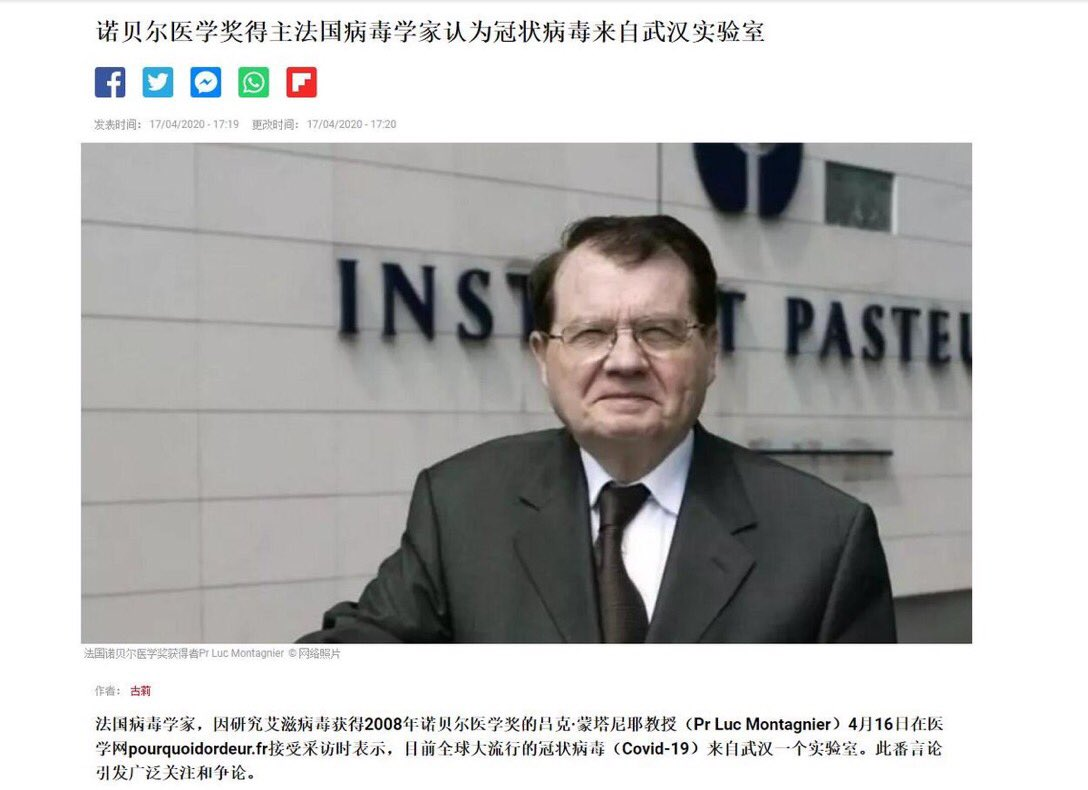 今天很多媒體都在轉載法國一個病毒學家他的結論。這病毒學家很厲害,是拿過諾貝爾生理醫學獎的。這是搞病毒的行家。他就說,這次中共病毒,是精心制造的產物。絕對不會在自然界裏形成。因為他在這個病毒裏發現了許多個艾滋病毒的基因片段。像這種多個片段,在另外一個,蝙蝠帶的冠狀病毒裏發現,這是一個非常精細的基因工程。而不是自然界裏偶然形成的。