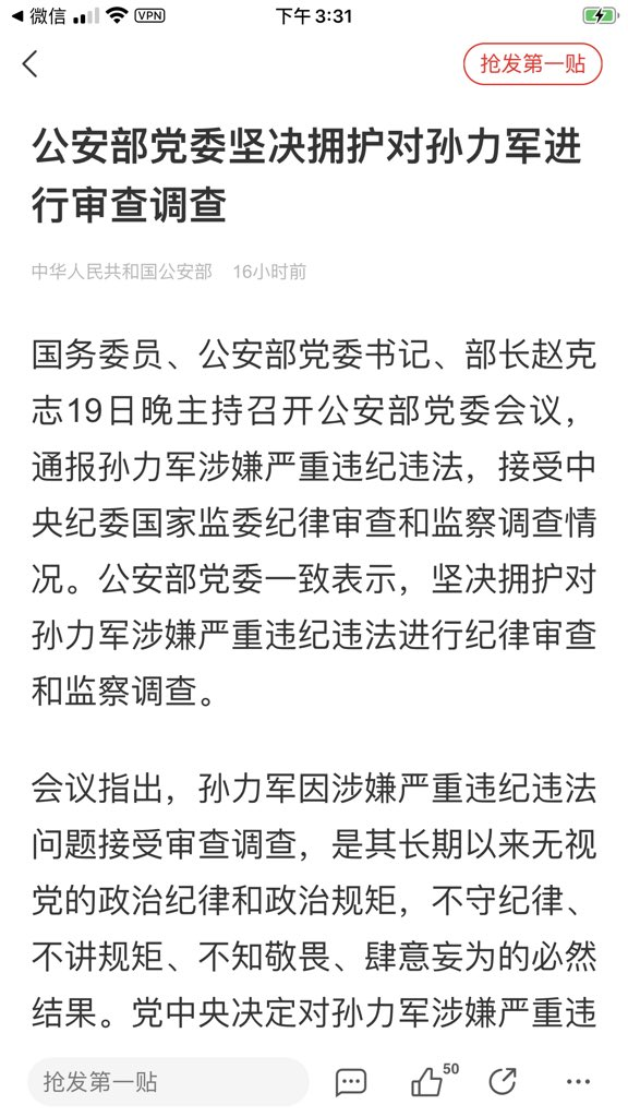 孫力軍在這個過程中,他一定是做了某些事,表示了某些態度,所以被習給盯上了。被有人給匯報上去了。大家記住。並不是孫力軍真正幹了多大的事了,真正的有個非常明確的政變計劃,要怎麽怎麽樣了,習才動他。不用到那一層。他表現出來,沒有絕對忠於習,然後有怨言,又跟其他的非習力量有接觸,這事他就死定了。不會等到他真搞事出來。他沒這個能力,他要是有這個能力,估計死的就更快。