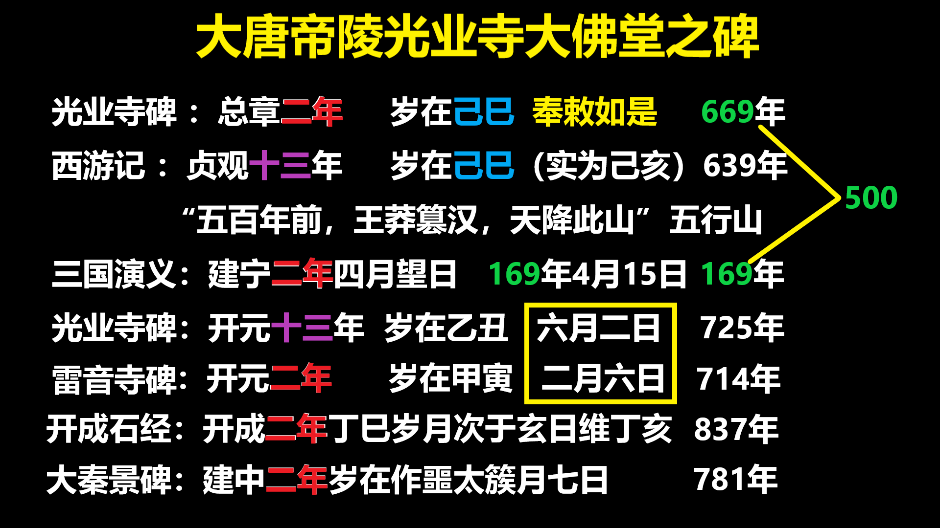 這個《大唐帝陵光業寺大佛堂之碑》它的落成時間,大家看,我往下給大家演示一下。“大唐開元十三年歲次乙醜六月癸醜二日甲寅”。它就等於給了年月日,三個幹支。但是今天明告訴大家,這月的幹支,這是錯的。因為正確的幹支是癸未。這碑上些的癸醜,這是錯的。