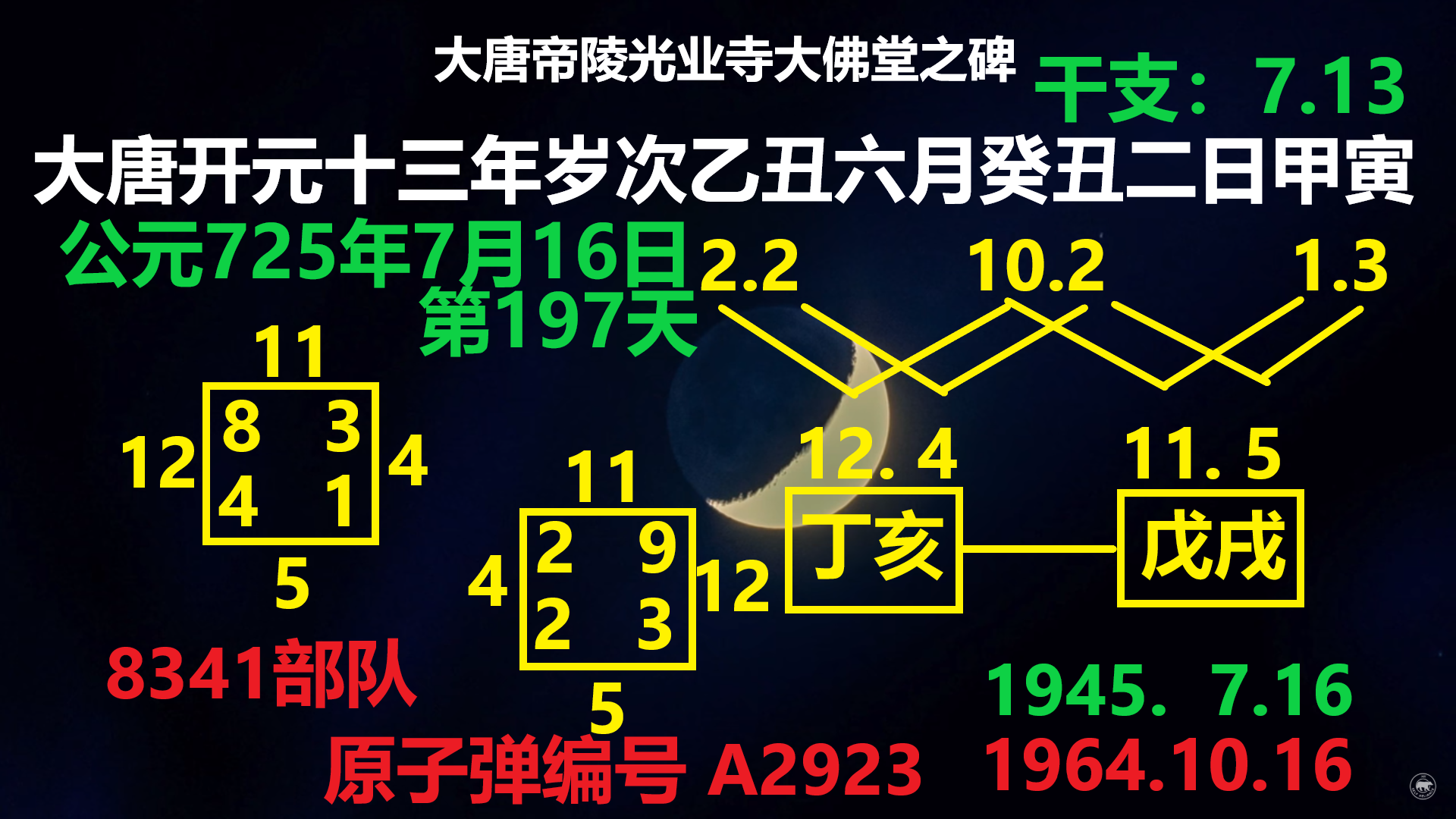 16日。為什麽特意的選這一天,其實有很多秘密。這個7月16號呢,它是黃道的一年的第197天。大家看這個右下角,中國第一顆原子彈爆炸是1964.10.16。世界第一顆原子彈爆炸是,是美國的,1945.7.16號,5點,29分。這個7.16,就在這放著呢。就在這放著7.16,然後第197天。