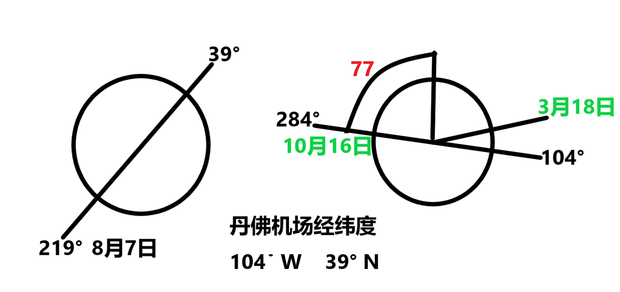 就像華盛頓為什么選到38.77°,就是跟丹佛機場為什么選在這個地方有關。它是一樣的道理。就是北緯39°,就像吉普森手里拿著螺旋槳一樣。它一頭39°的時候,它這一頭就指向219°。219°,它是黃道365天的8月7號。大家記住這個8月7,記住這個87。然后呢,西經104°,104°對應了284°。284°它是倒數的第77°,然后它對應黃道的77°的,就是10月16,這邊就對應3月18。這就是3月18的由來。大家記住剛才共濟會,1994年3月19號送給2094年的時間膠囊,那個日期,1994年3月19號,滿一百年正好是2094年的3月18號。大家要記住,這就是它的那個秘密。