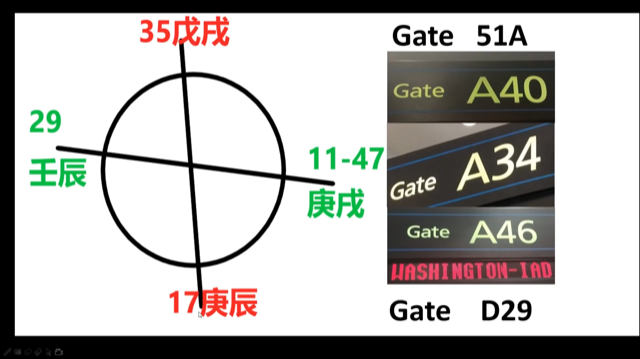 什么叫做秘密呢?秘密就在這。天意。A是1,1+40=41,1+34=35,1+46=47。然后等到我從華盛頓返回洛杉磯的時候,就是29登機口。35,47,29,41,就是35,29, 17, 47相加產生的58,1114,再相加產生的這個四個數。41是甲辰,41-12=29,壬辰。這就是四個魁罡星。